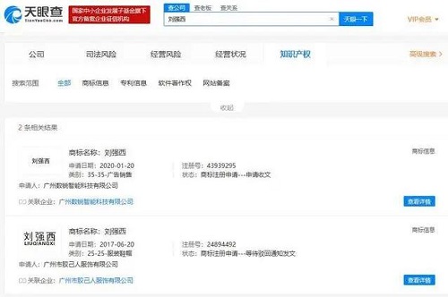 天眼查App顯示,“劉強(qiáng)西”和“章小天”已被注冊(cè)商標(biāo)。今年1月,廣州數(shù)銳智能科技有限公司申請(qǐng)注冊(cè)“劉強(qiáng)西”的商標(biāo),商標(biāo)國(guó)際分類為廣告銷售,該商標(biāo)已于今年9月公示為“已注冊(cè)”。