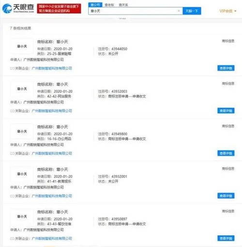 此外,廣州數(shù)銳智能科技有限公司還申請(qǐng)注冊(cè)了“章小天”的商標(biāo),商標(biāo)國(guó)際分類涉及網(wǎng)站服務(wù)、辦公用品、教育娛樂(lè)、餐飲住宿、廣告銷售等,申請(qǐng)日期均在今年1月,商標(biāo)狀態(tài)多數(shù)顯示為“已注冊(cè)”。