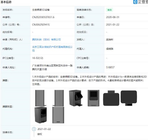 騰訊被授權“全息裸眼3D設備”外觀專利