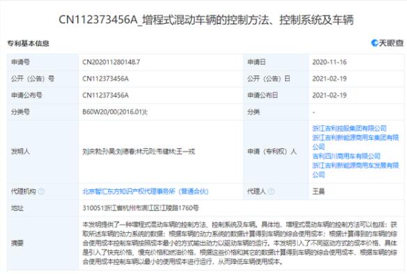 浙江吉利控股集團(tuán)有限公司公開(kāi)了一名為“增程式混動(dòng)車輛的控制方法、控制系統(tǒng)及車輛”的發(fā)明專利,專利申請(qǐng)時(shí)間為2020年11月16日。