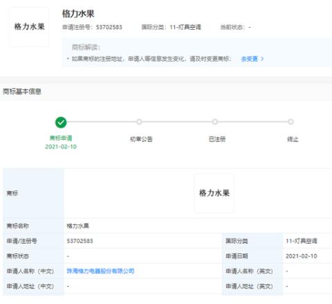 近日珠海格力電器股份有限公司申請(qǐng)注冊(cè)“格力水果”商標(biāo),申請(qǐng)日期為2021年2月10日,涉國(guó)際商標(biāo)分類為11-燈具空調(diào),商標(biāo)狀態(tài)顯示為“商標(biāo)申請(qǐng)中”。