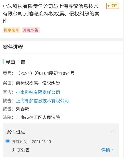 6月29日,小米科技有限責(zé)任公司起訴拼多多關(guān)聯(lián)公司上海尋夢(mèng)信息技術(shù)有限公司,案由系商標(biāo)權(quán)權(quán)屬、侵權(quán)糾紛,案號(hào)(2021)滬0104民初11091號(hào),經(jīng)辦法院為上海市徐匯區(qū)人民法院,一審開庭時(shí)間為8月13日。