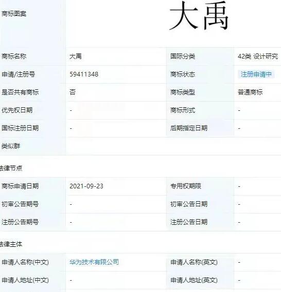 近日,華為技術有限公司申請注冊大禹商標,商標國際分類涉42類設計研究,目前商標狀態為注冊申請中。
