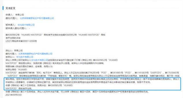 近日,華為技術有限公司新增商標文書,類型為商標異議決定書,文書正文顯示,異議人為蘋果公司,涉及商標為 "HUAWEI MATEPOD" 商標。蘋果公司認為該商標惡意模仿、抄襲 "AIRPODS"、"EARPODS" 等商標,國家知識產權局認為證據不足、缺乏事實依據并準予華為公司 "HUAWEI MATEPOD" 商標注冊。
