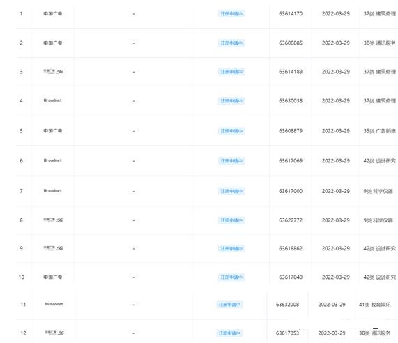 就在不久前的3月29日期間,中國廣電集團公司一口氣報送了共計12項商標注冊申請信息,其中包含了一項簡體中文商標“中國廣電”、一項英文商標“Broadnet”、一項組合圖文商標。12項商標信息涉及的具體類別共計6大類,分別為建筑修理、通訊服務、廣告銷售、設計研究、科學儀器、教育娛樂。