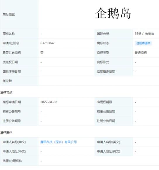 近日,騰訊科技(深圳)有限公司申請注冊“企鵝島”圖案商標(biāo),國際分類涉35類廣告銷售,目前商標(biāo)狀態(tài)為“注冊申請中”。