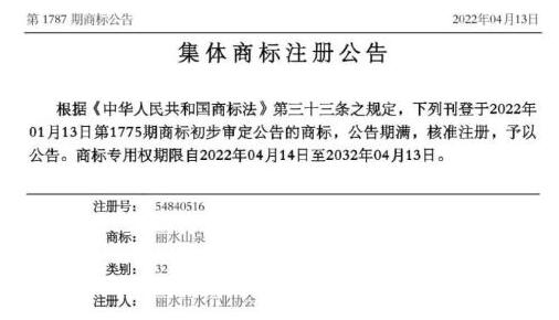 國家商標局發(fā)布《集體商標注冊公告》,“麗水山泉”集體商標結束3個月的初審公告期,正式核準注冊,這是麗水“山字系”品牌建設之路上的又一個里程碑!