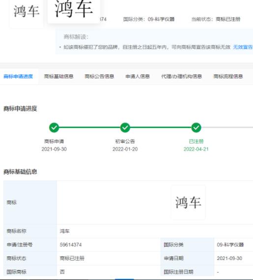 4月21日消息,華為技術有限公司申請注冊的“鴻車”商標注冊成功,國際分類涉及科學儀器、網站服務,申請日期為2021年9月。
