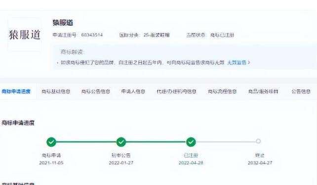 近日,猿輔導(dǎo)旗下北京冰原服飾有限公司(下稱“冰原服飾”)申請的多個“猿服道”商標(biāo)注冊成功,國際分類為服裝鞋帽、皮革皮具、材料加工,申請日期為2021年11月。