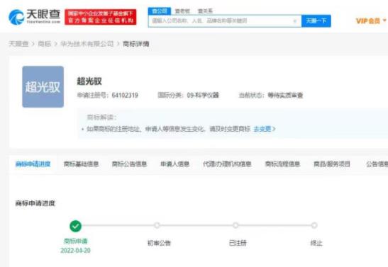 天眼查App顯示,近日,華為技術有限公司申請注冊“超光變”“超光馭”“超視域”商標,國際分類均為科學儀器,當前商標狀態為等待實質審查。