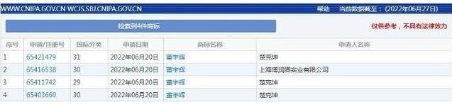 據國家知識產權局商標局官網,“董宇輝”商標近日被上海博潤騰實業有限公司、自然人楚克坤申請注冊,國際分類包括咖啡、茶、米面、巧克力、糕點甜食等,查詢商標詳情顯示:此商標正等待受理,暫無法查詢詳細信息。