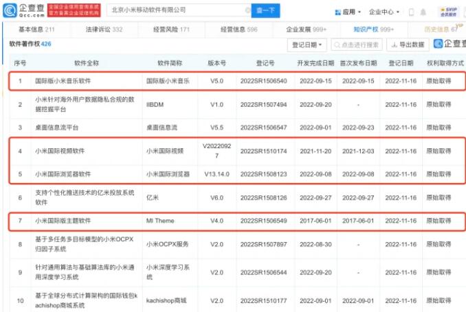 企查查APP顯示,近日,北京小米移動軟件有限公司“國際版小米音樂軟件”“小米國際版主題軟件”“小米國際瀏覽器軟件”著作權獲得登記批準。