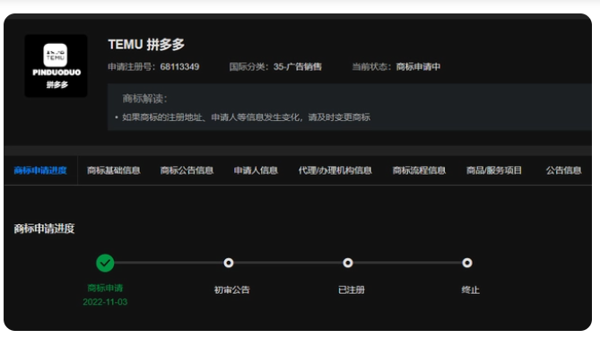 11月24日,天眼查顯示,近日,拼多多關聯公司上海尋夢信息技術有限公司申請注冊“TEMU拼多多“商標,國際分類為廣告銷售,當前商標狀態為申請中。據悉,“Temu”為拼多多旗下跨境電商平臺,今年9月正式在海外上線。