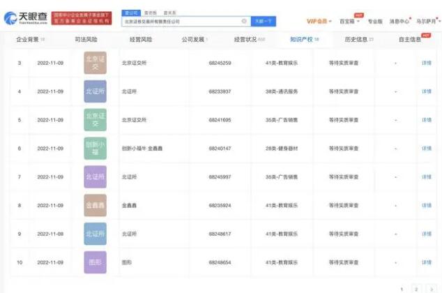 天眼查App顯示,近日,北京證券交易所有限責任公司申請注冊多個“北京證券交易所 BEIJING STOCK EXCHANGE”“北京證交所”“ 北證所”商標,國際分類包括通訊服務、教育娛樂等,目前商標狀態均為申請中。