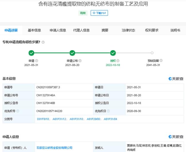 天眼查App顯示,近日,石家莊以嶺藥業股份有限公司申請的“含有連花清瘟提取物的紡粘無紡布的制備工藝及應用”專利獲授權。