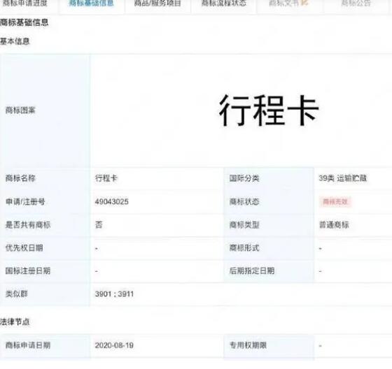企查查App顯示,上海一科技公司曾申請注冊一枚“行程卡”商標,國際分類包括39類運輸貯藏,商品服務項目包括旅行指南服務、機票預訂服務、導航等,該商標申請于2020年8月,2021年3月,該商標被駁回。