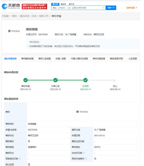 天眼查App顯示,騰訊科技(深圳)有限公司曾多次申請(qǐng)“微信鍵盤”商標(biāo),其中去年3月申請(qǐng)的多枚商標(biāo)已成功注冊(cè),今年3月再次申請(qǐng)的多枚商標(biāo)狀態(tài)為“駁回復(fù)審中”。此外,騰訊公司還于近日申請(qǐng)注冊(cè)多個(gè)“微信輸入法”圖形商標(biāo),國(guó)際分類涉及科學(xué)儀器、教育娛樂(lè)、通訊服務(wù)等,當(dāng)前商標(biāo)狀態(tài)均為等待實(shí)質(zhì)審查。