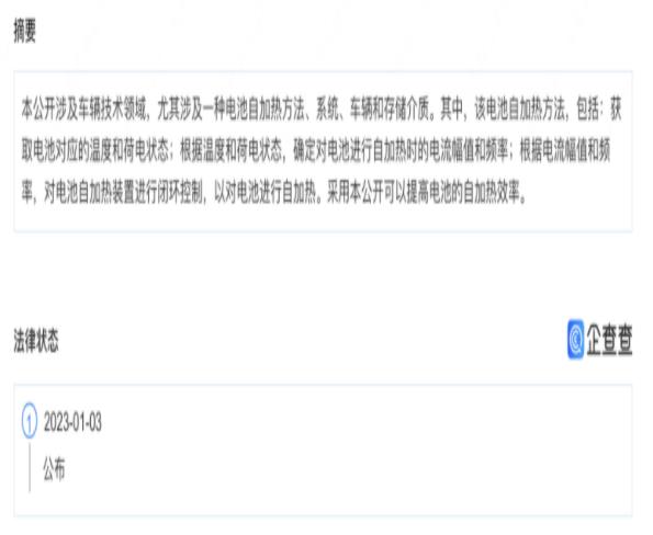 據企查查APP顯示,近日,小米汽車科技有限公司“電池自加熱方法、系統、車輛和存儲介質”專利公布。